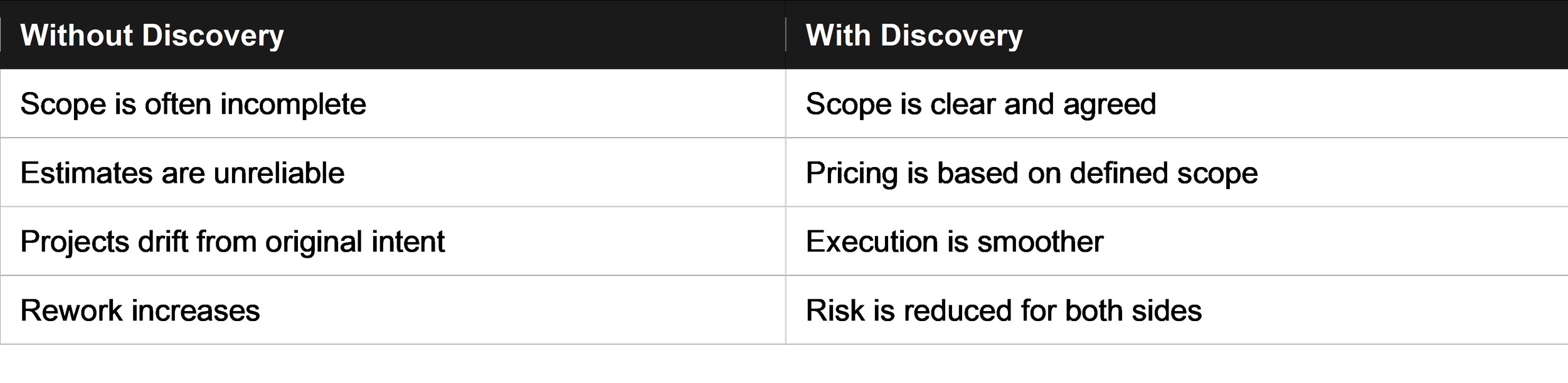 Without this step, estimates are unreliable and projects are exposed to scope drift. Discovery ensures both sides understand exactly what is being built before delivery begins.